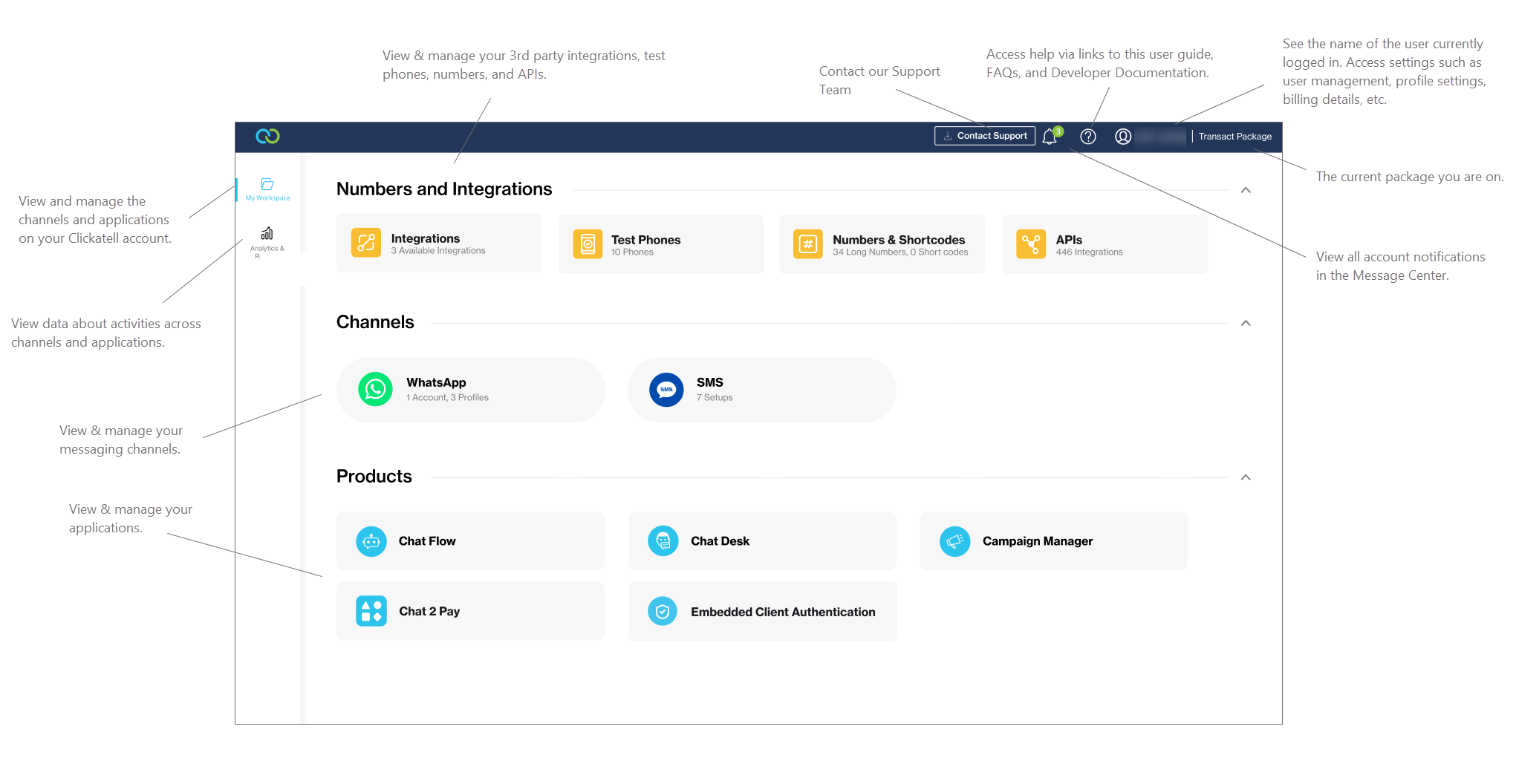 This serves as the "main dashboard". View and manage all channels, applications, numbers, test phones, and API integrations on your Clickatell account.
