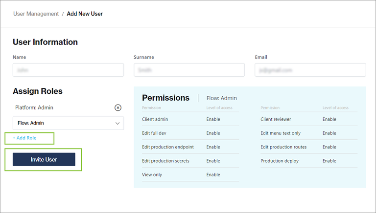 Select a role from the drop-down for more information about the permissions associated with the role (view in the blue block).