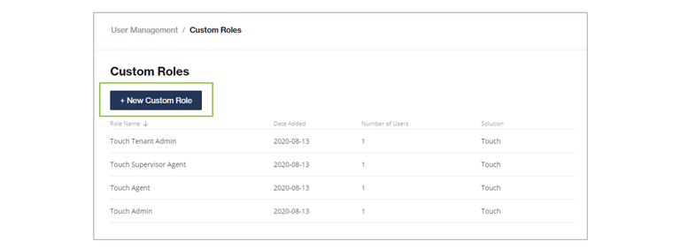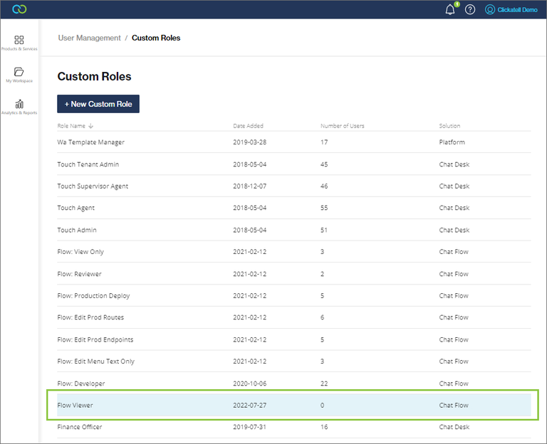 The new custom role is added to the Custom Roles table and is available to assign to users when adding new or updating existing users.
