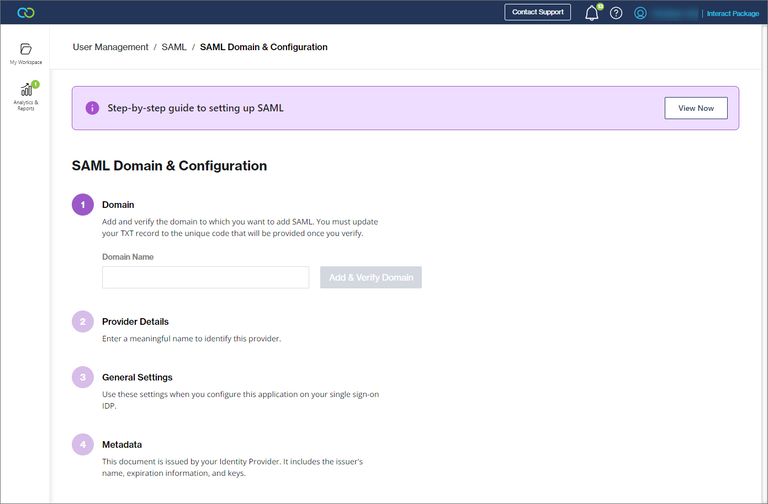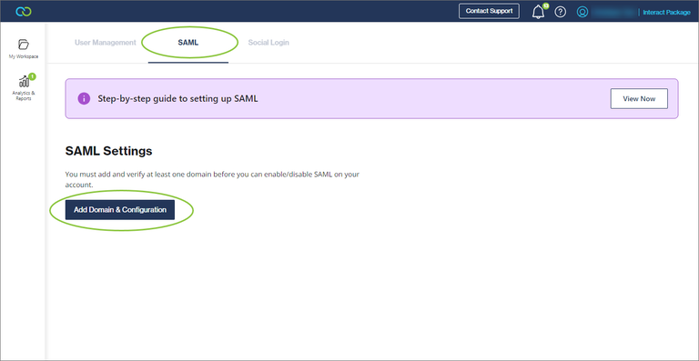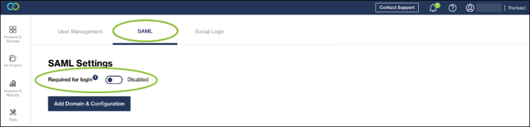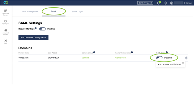 When the SAML configuration is complete, enable SAML login for the domain using the toggle switch.