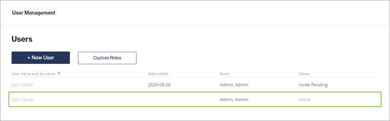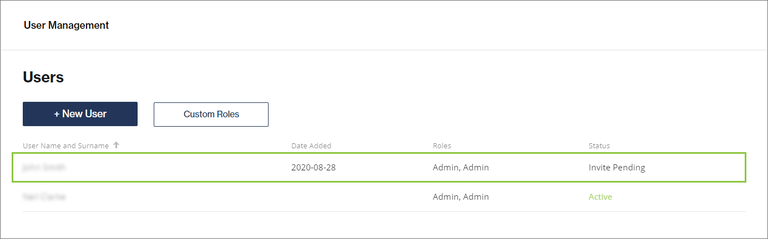 The new user is added to the Users table with the status of "Invite Pending". This will change to "Active" once the user accepts the invitation and logs in to the portal.