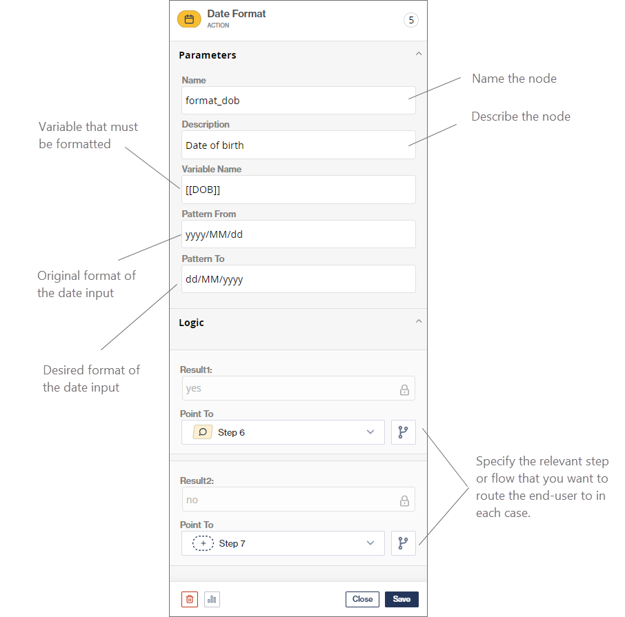 For example, if a user enters a date in yyyy-MM-dd format and we want to convert it into dd-MM-yyyy format, you can use the Date Format node. After a successful conversion, the node will return a "Yes" response. If the conversion failed, the node will return a "No" response.