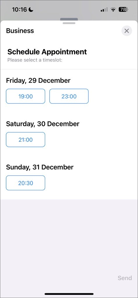 Allow your customers to schedule an appointment. Display available slots to your customers and allow them to pick the one that suits them best. This interactive message also displays conflicts found on the customer’s local calendar to help the customer make a better decision.