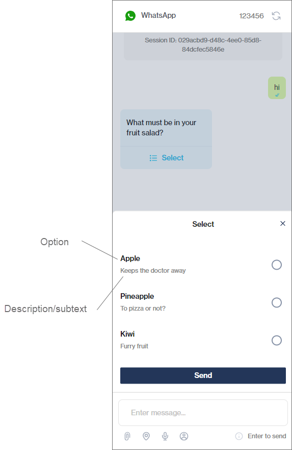 A customer wants to order a fruit salad consisting of five different fruits from inside the WhatsApp channel. Assume that, as part of their profile, you already have access to all the flavors they dislike and are allergic to. Based on this information, you can now show them only those options that are aligned with their preferences, and they can make their selection from those options.