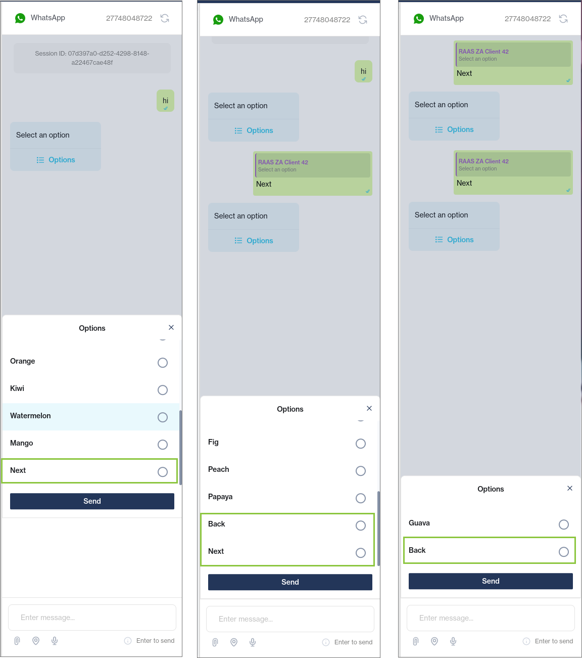 If the list is more than 10 items, the first nine items of the list will be shown as per usual, and the 10th option will be a Next button. When the user clicks the button, the following nine items appear. The flow-builder can customize the text of the option the customer selects to go to the next or the previous set of options.