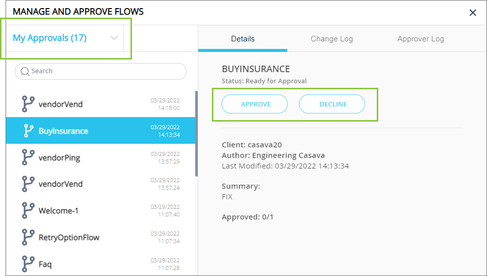 Approver log - records who made the above changes by either approving or declining a flow