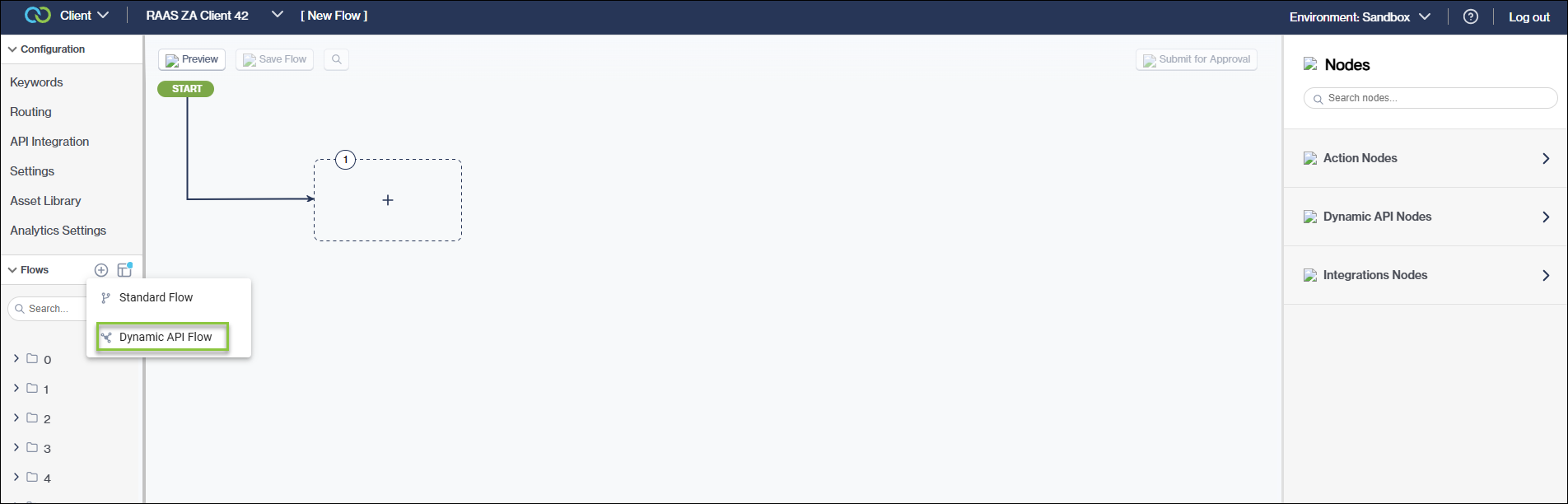 Select Dynamic API flow under Flows from the menu on the left. A Start node and arrow will automatically appear on your canvas as the starting point for your flow.