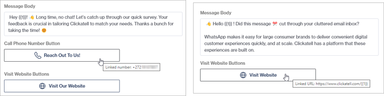 Static and dynamic URLs: As set up via the Clickatell Portal and approved by Meta.