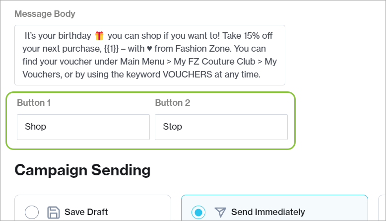 Quick replies: As set up via the Clickatell Portal and approved by Meta.