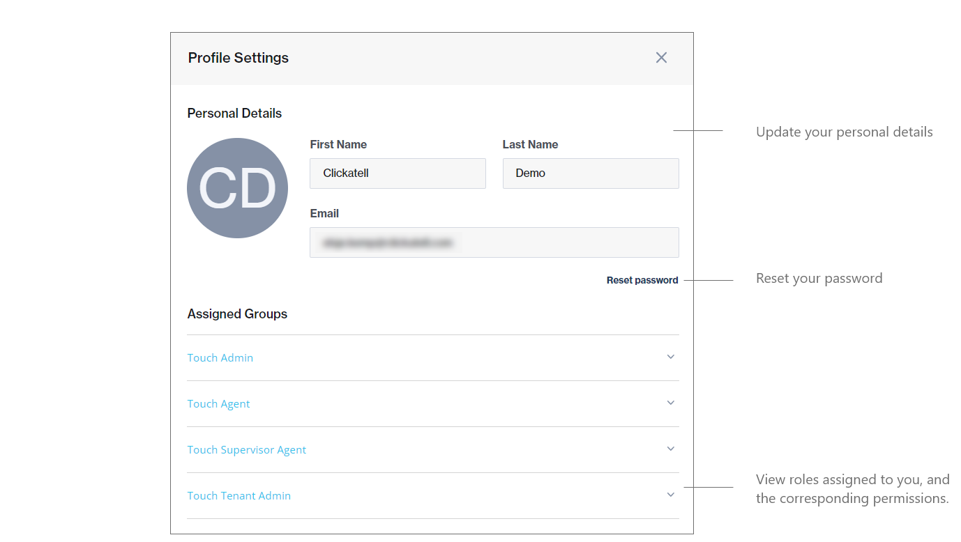 From here you can reset your password and view your specific permissions based on the role assigned to you.