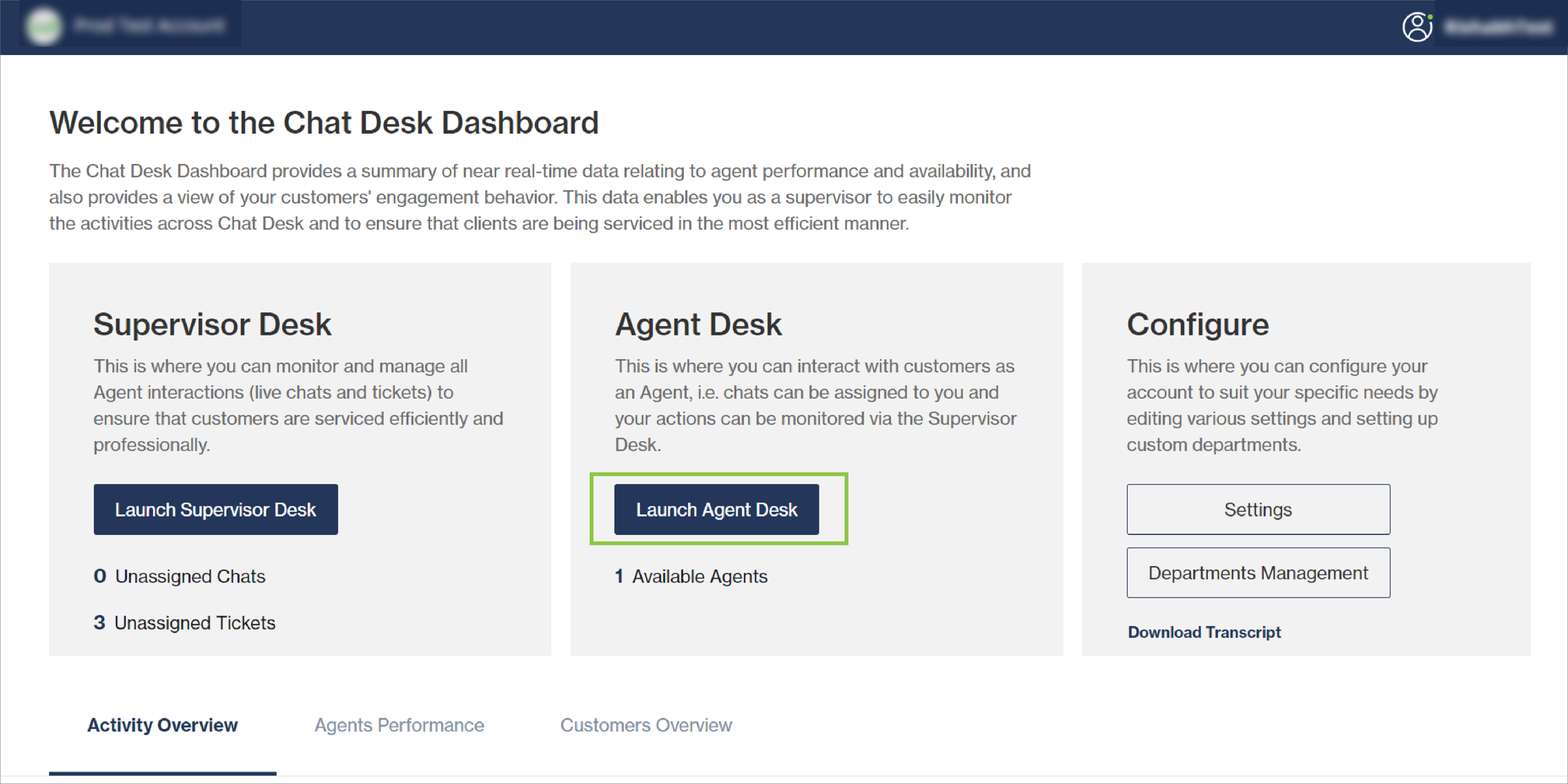 Click Launch Agent Desk to launch the Agent Desk in a new tab.