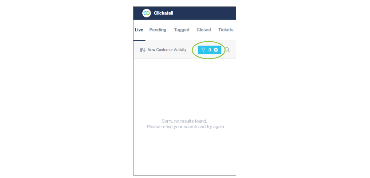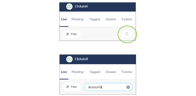 As an agent, you can quickly and easily find a specific chat that you want to respond to or reference by using the search and/or filter functionalities. This can be applied to live chats, closed chats, or tickets.