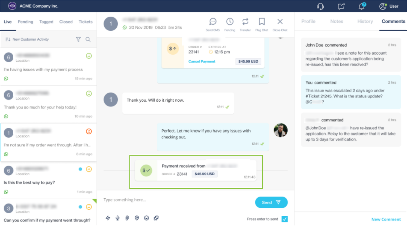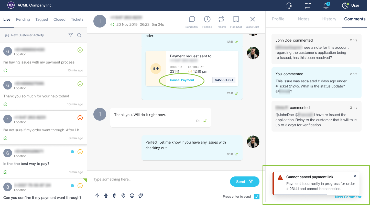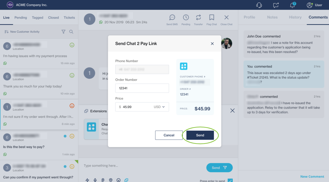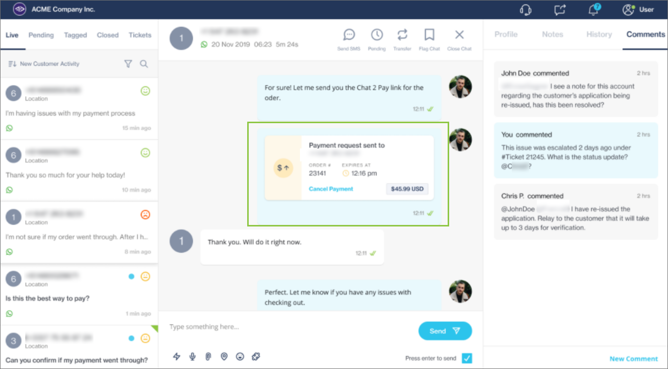 As an agent, you can use the Chat 2 Pay extension to send a payment request to a customer directly from Chat Desk.