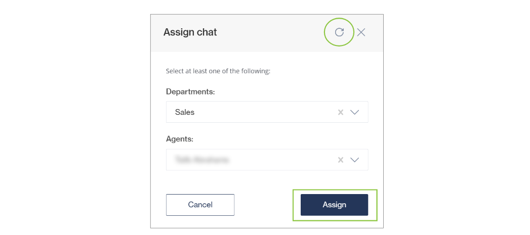 The pop-up automatically refreshes when it is first opened. Use the refresh button to refresh the list of available departments and agents manually.