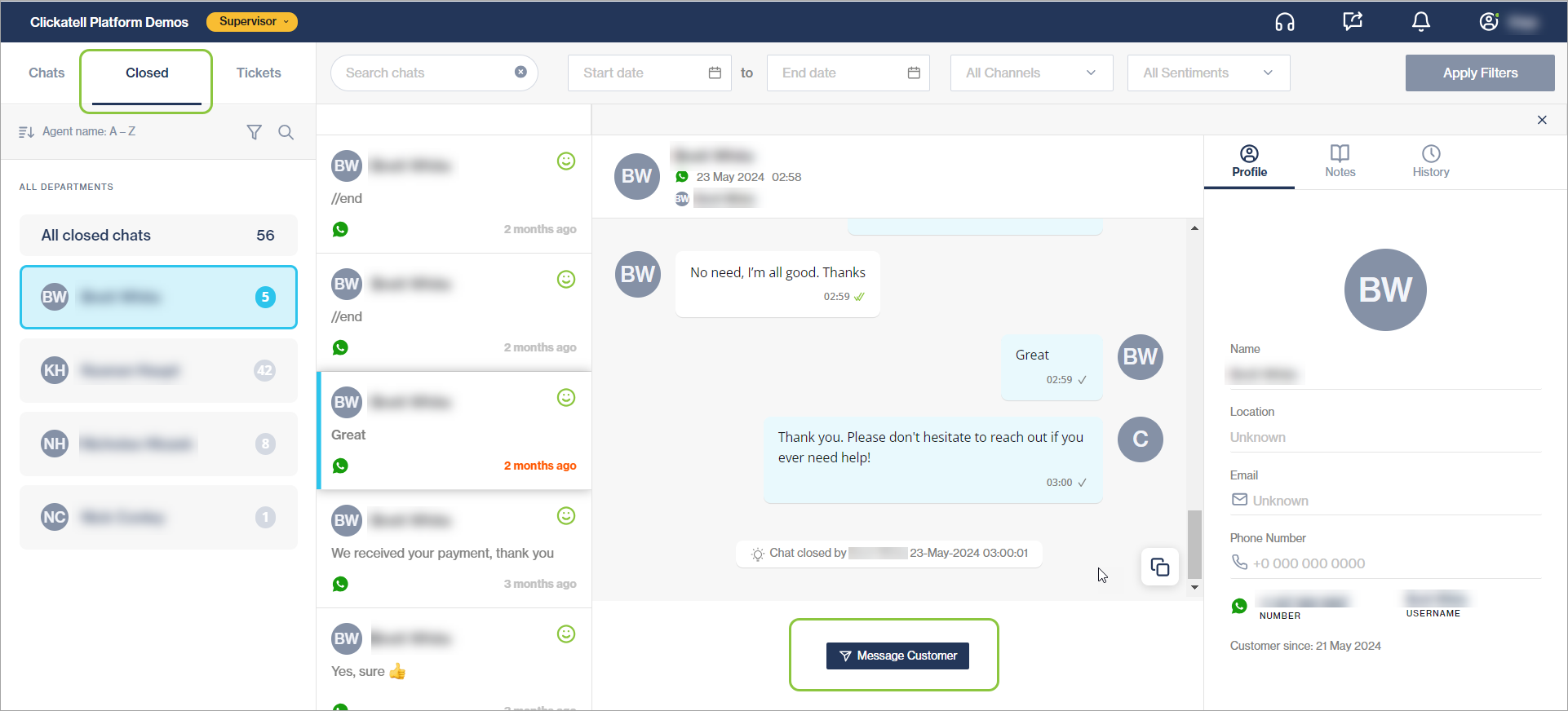 Select the closed chat and send a message via WhatsApp or SMS (depending on the channel the customer originally engaged on).