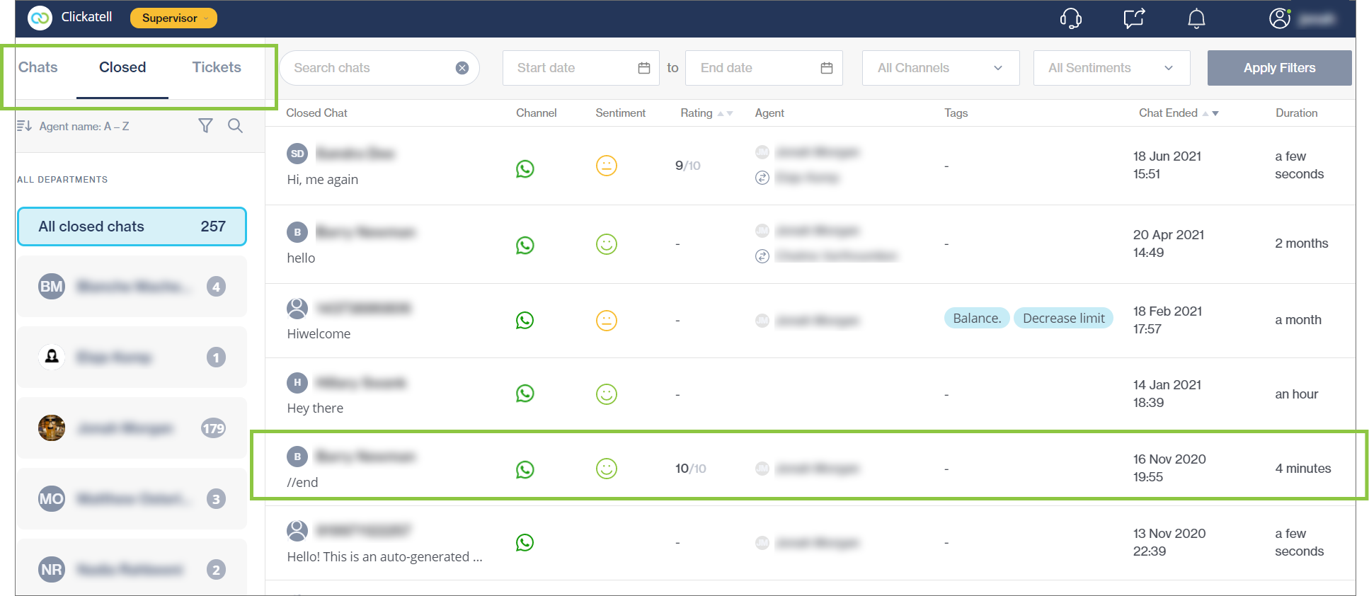 In each tab, chats are grouped by agent with an indication of the total number of chats for that agent.