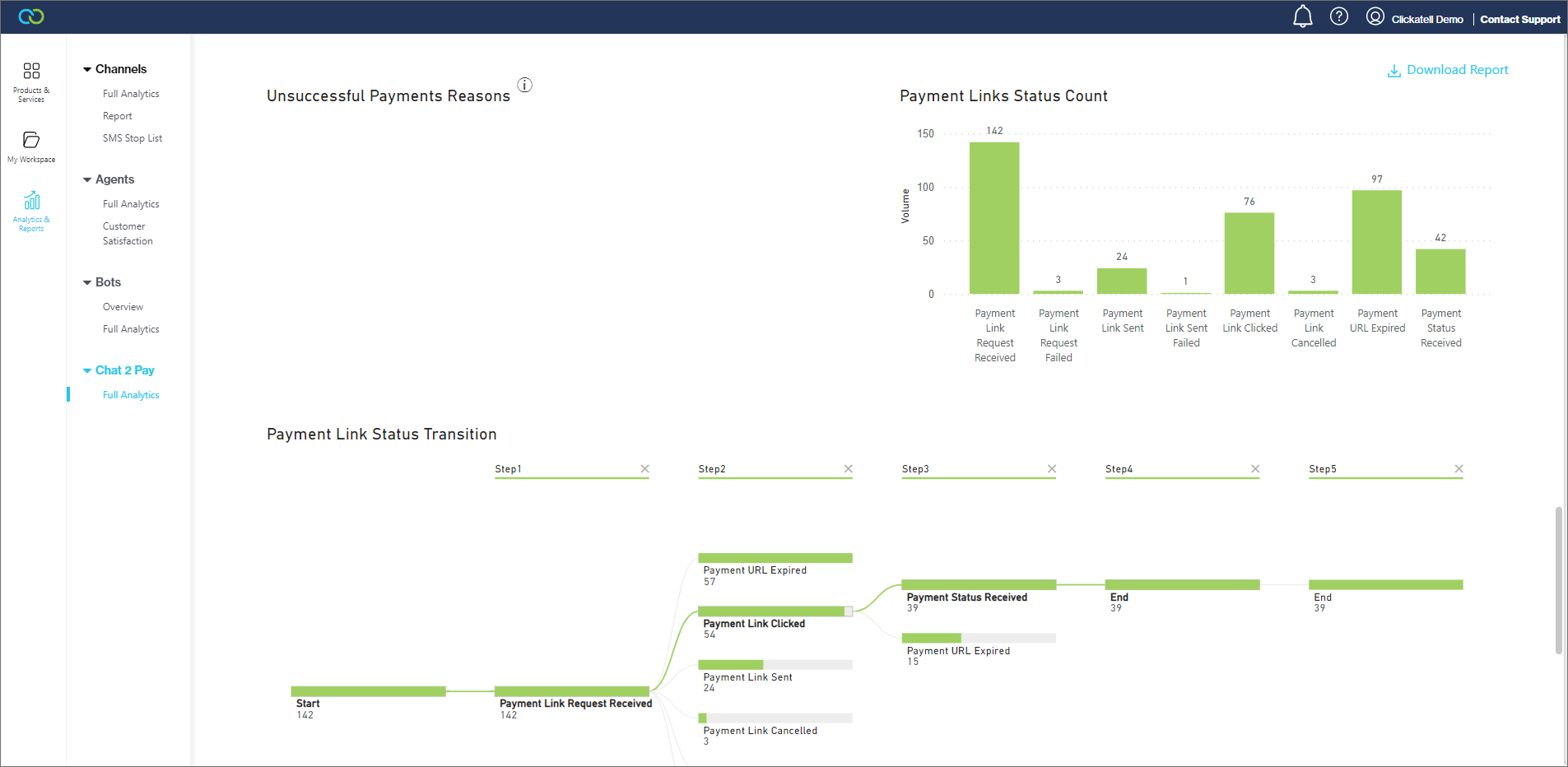 At the top of the report, various metrics summarize how Chat 2 Pay is performing.