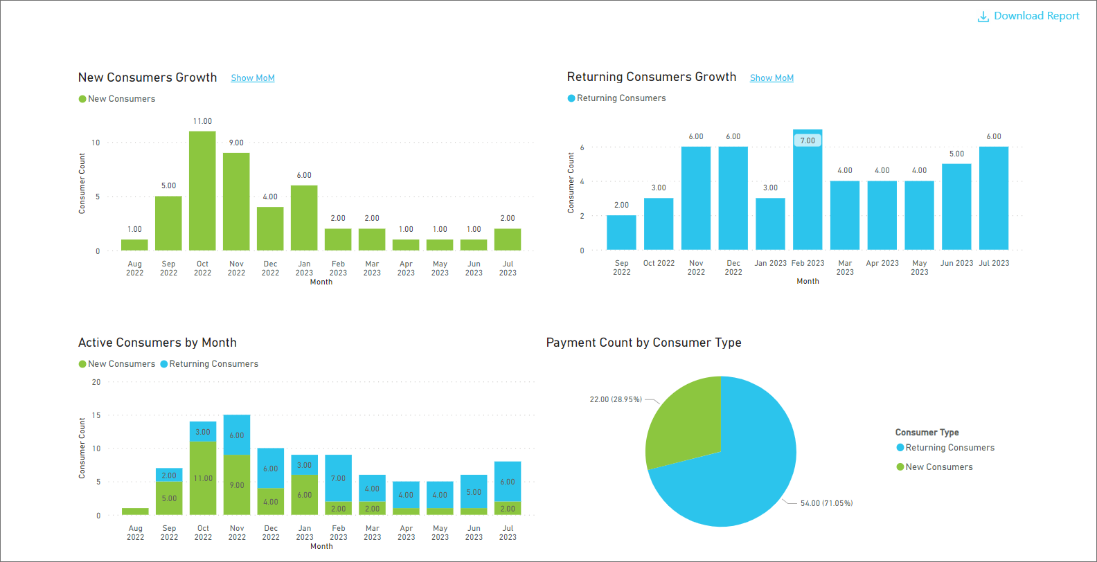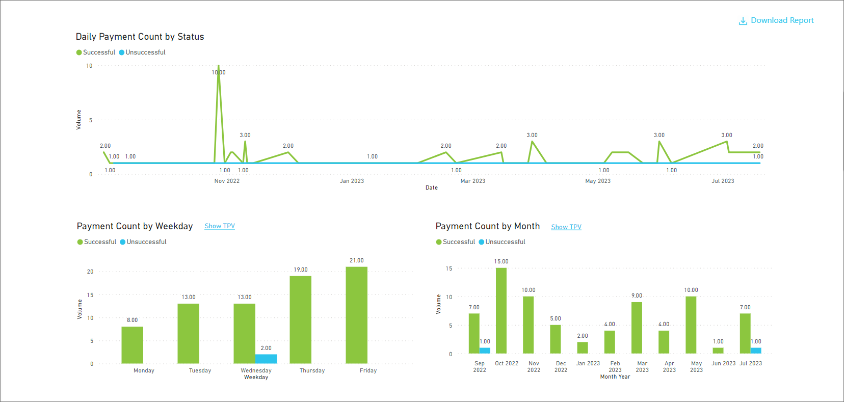 Number of successful payments, their value, and the success rate.