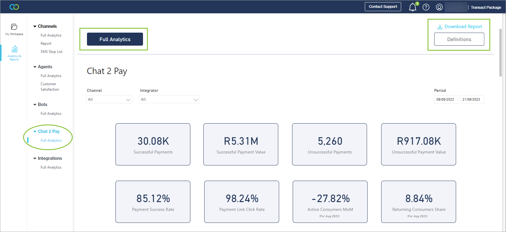 Get an overview of the Chat 2 Pay activity on your account. You can view it for a selected date range, channel, or integrator.