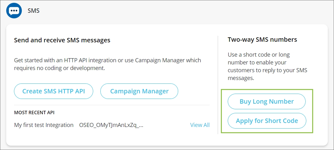 If you want to both send SMS messages and receive replies, you need to acquire a two-way number. You can either apply for a short code or purchase a long number by selecting your preferred option from the Launchpad or by navigating to SMS → SMS add-ons and following the prompts.