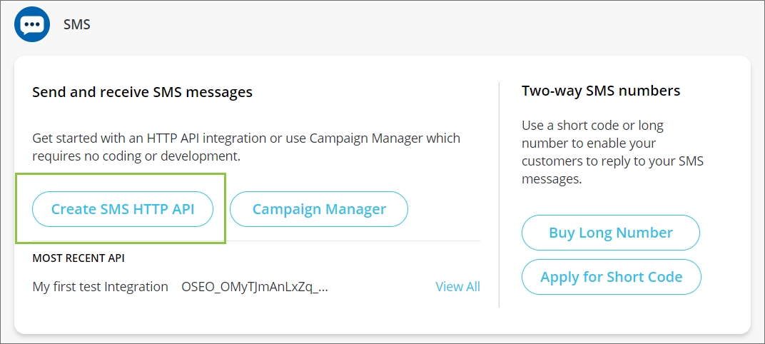 On your Launchpad, click on the ‘Create SMS HTTP API‘ button in the SMS section and complete the three steps that are displayed on the screen. The resulting API Key is the authentication token used to call and unlock your specific integration service.