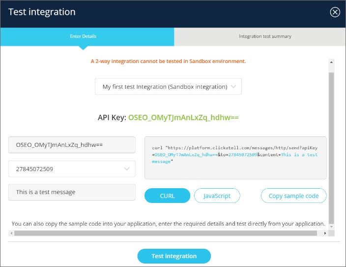Click the ‘Create new integration’ button and complete the setup wizard. You will have to specify the messaging type (one-way or two-way) and delivery type (standard or time-critical), and edit message-specific settings to fit your needs. Once you’ve saved your integration, you will be presented with your API key.