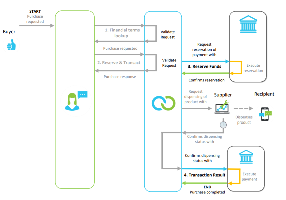 If the bank confirms the reservation status as successful, Clickatell continues by facilitating the dispensing of the product that the buyer purchased