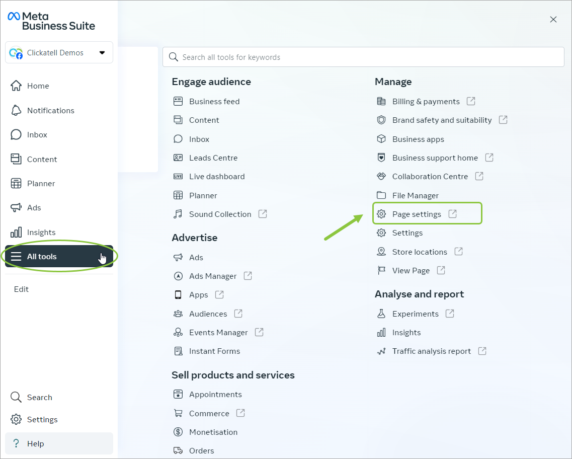 Log in to your Facebook Business Manager account and select All tools in the left panel and then Page Settings.