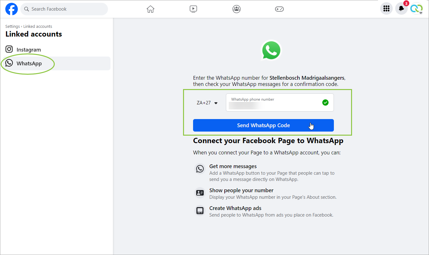 You'll receive a confirmation code via WhatsApp on the number you've entered above. Enter the code and click Confirm. Your WhatsApp account is now connected to your Facebook Page.