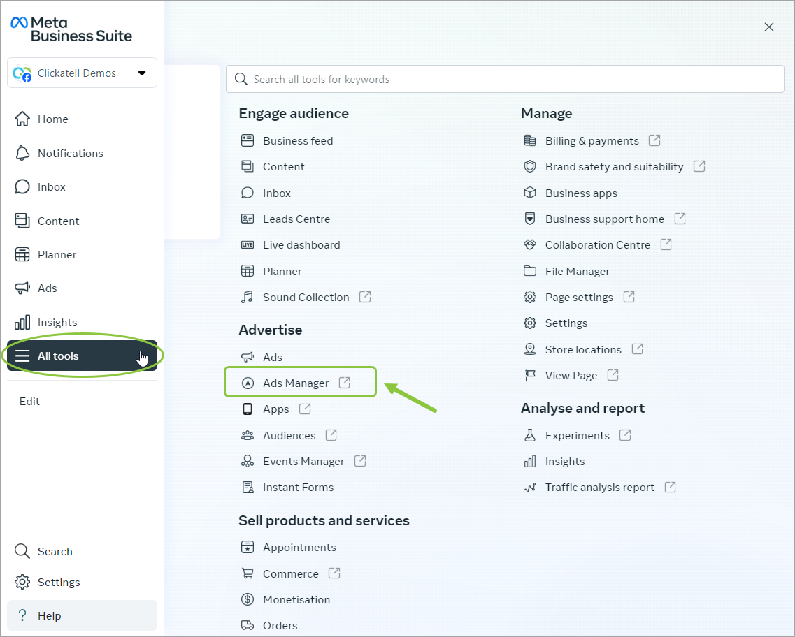 In Facebook Business Manager, select All tools in the left panel. Select Ads Manager.