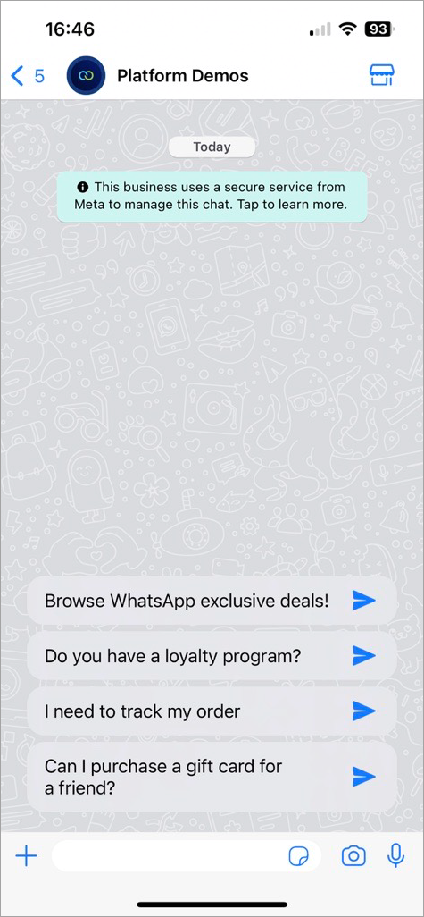 Icebreakers are great for service interactions, such as customer support or account servicing. For example, you can embed a WhatsApp button on your app or website. When a customer taps the button, they're redirected to your WhatsApp Business account and presented with a set of options they can select from to guide their interaction further. Customers can tap one of these options as a response, or type in a custom response in the message field.