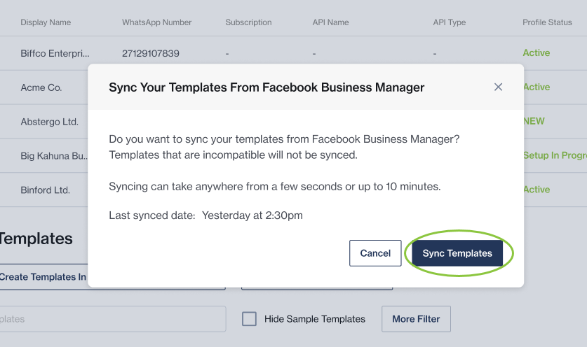 Return to the WhatsApp Account Details page in your Clickatell Portal. You will be prompted to sync your templates.