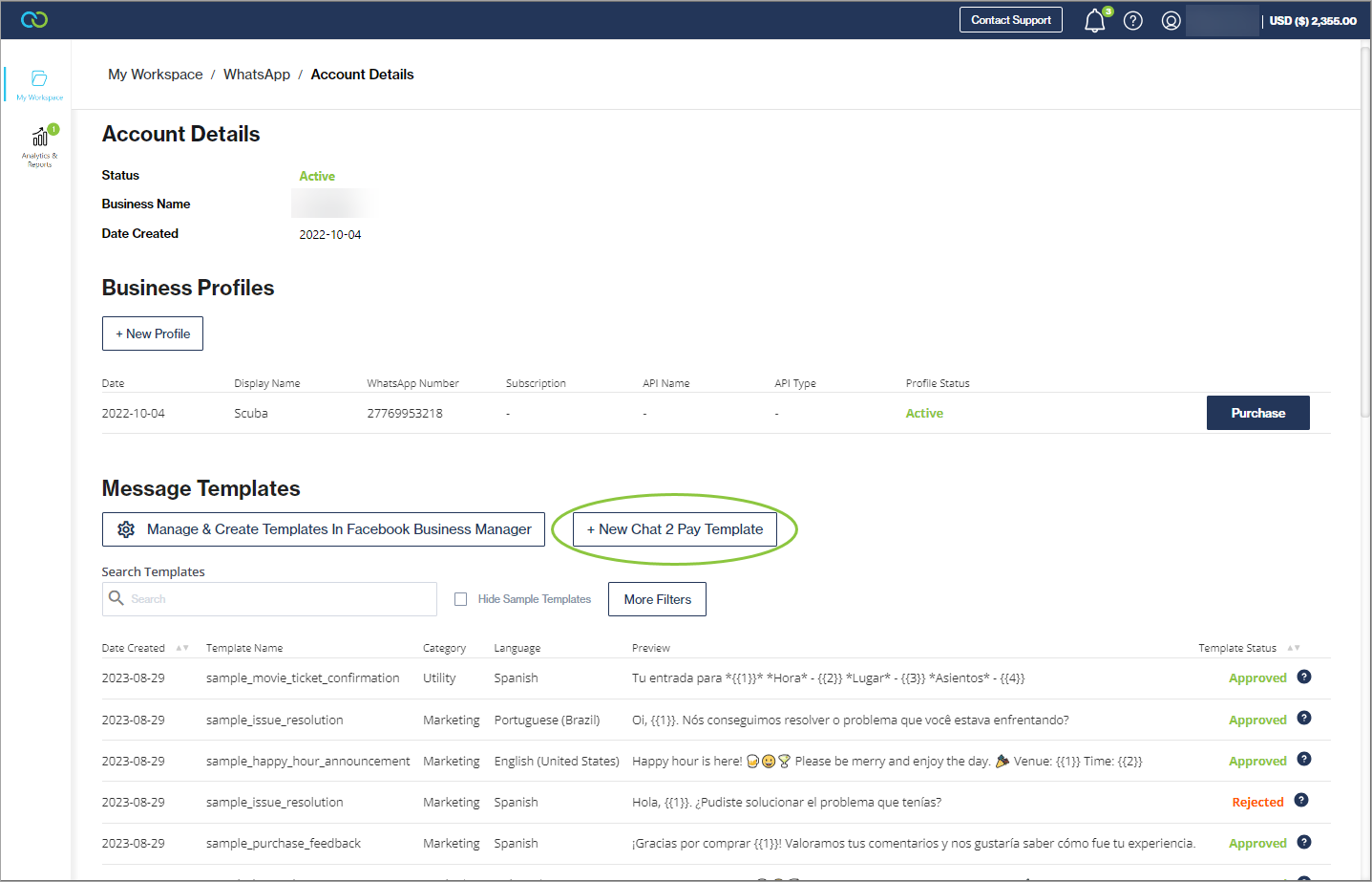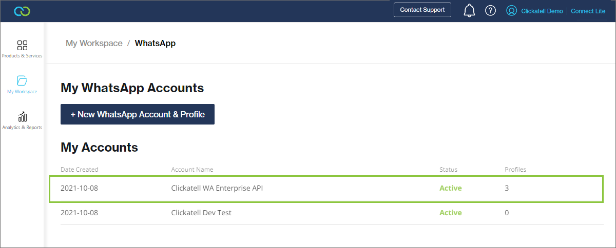 Navigate to My Workspace --> WhatsApp and select a WhatsApp account from the table.